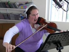 Just when you thought it was safe to listen to chamber music, along comes the merry pranksters of the strings! Clowning mode definitely on, that's the terror of the fiddle Bridget on the left, in the middle it's Lars the Romantic of Leucadia showing how it's done, and on the right is Pam the switchfoot of the viola.