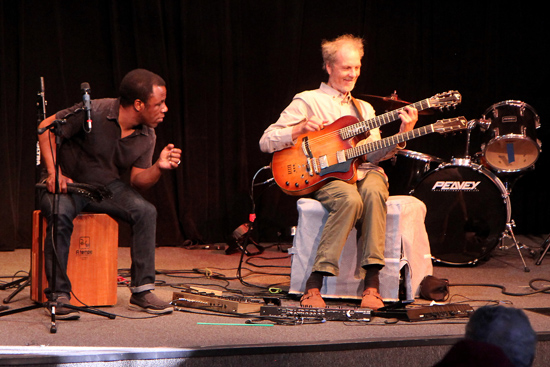I’ve got some funny chord going on and Leonard’s trying to memorize the fingering.