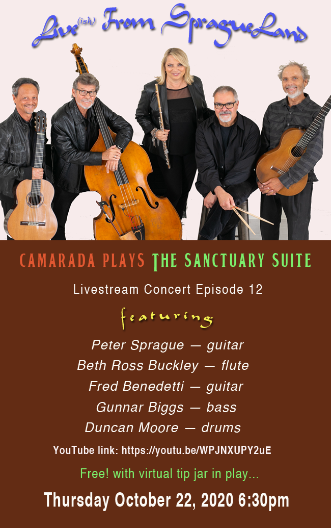 The band includes some of the best with Beth Ross Buckley on flute, Fred Benedetti on guitar, Gunnar Biggs on bass, Duncan Moore on drums, and me on guitar.
