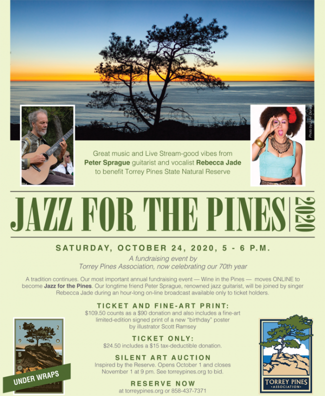 TICKET AND FINE-ART PRINT: $109.50 counts as a $90 donation (previous price of $99.50 was an “early bird” rate, which has expired). A signed, limited-edition Torrey Pines commemorative poster is part of your ticket. Designed and illustrated by nationally recognized designer Scott Ramsey, in the style of classic national park posters, it is printed on Mohawk, ‘Superfine’, 80-lb. cover, archival paper, 19″X 28.5″. A collector’s treasure!